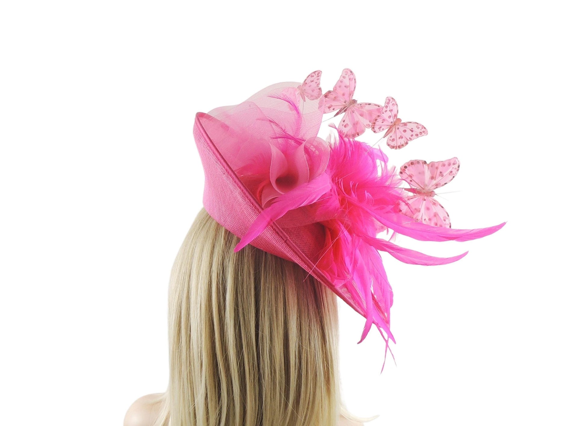 Make a bold statement with the Solange Fascinator, a stunning headpiece designed for race days, weddings, high tea, and formal garden parties. Featuring a large, fluffy spray of feathers, delicate floating butterflies, and elegant crinoline detailing, all set on a dramatic upturned sinamay hatinator base.