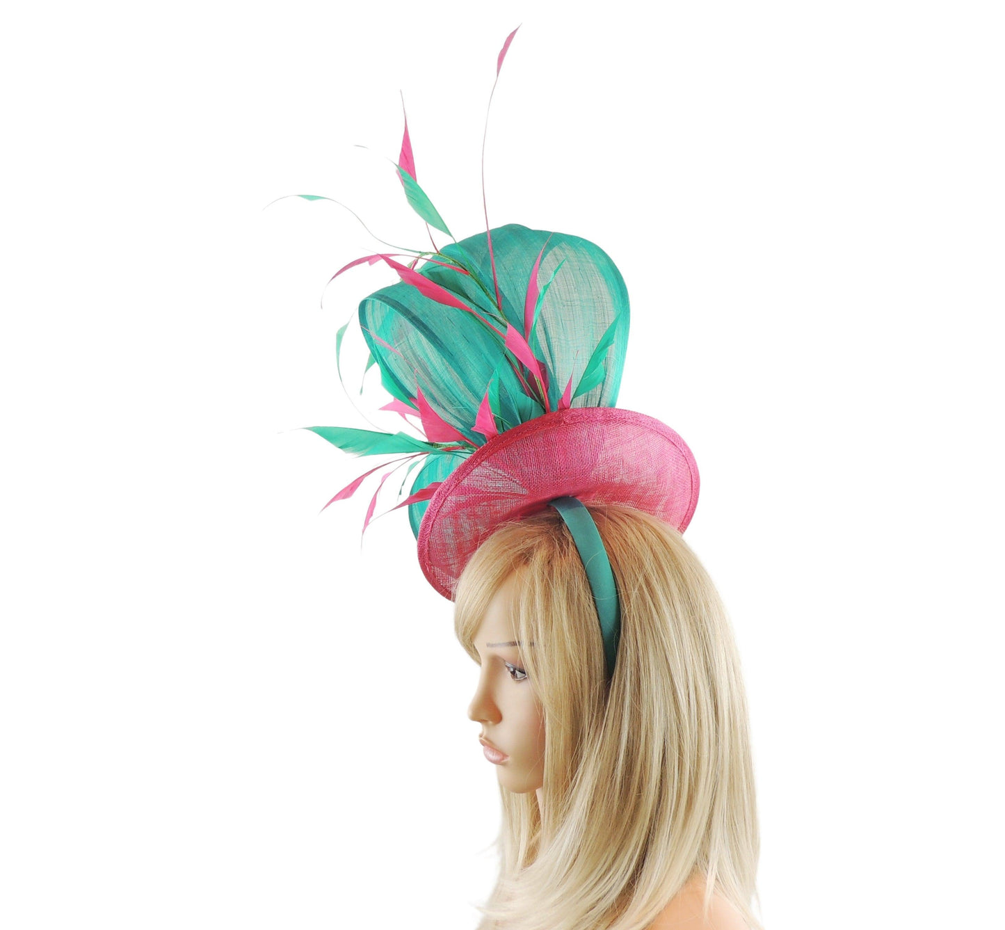 Fuchsia Hot Pink Emerald Jade Green Large Kentucky Derby Hat Statement Fascinator KY Woman Feather Tea Party Wedding Headband Cocktail Hat