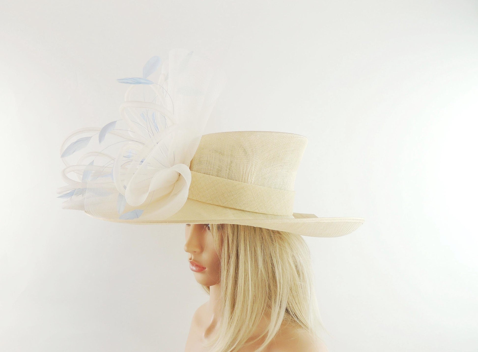 Cream & Powder Blue Kentucky Derby Hats Ascot SMALL HEAD Church Tea Garden Party Lunch Feather Wide Brim Wedding Formal Occasion Woman Hat