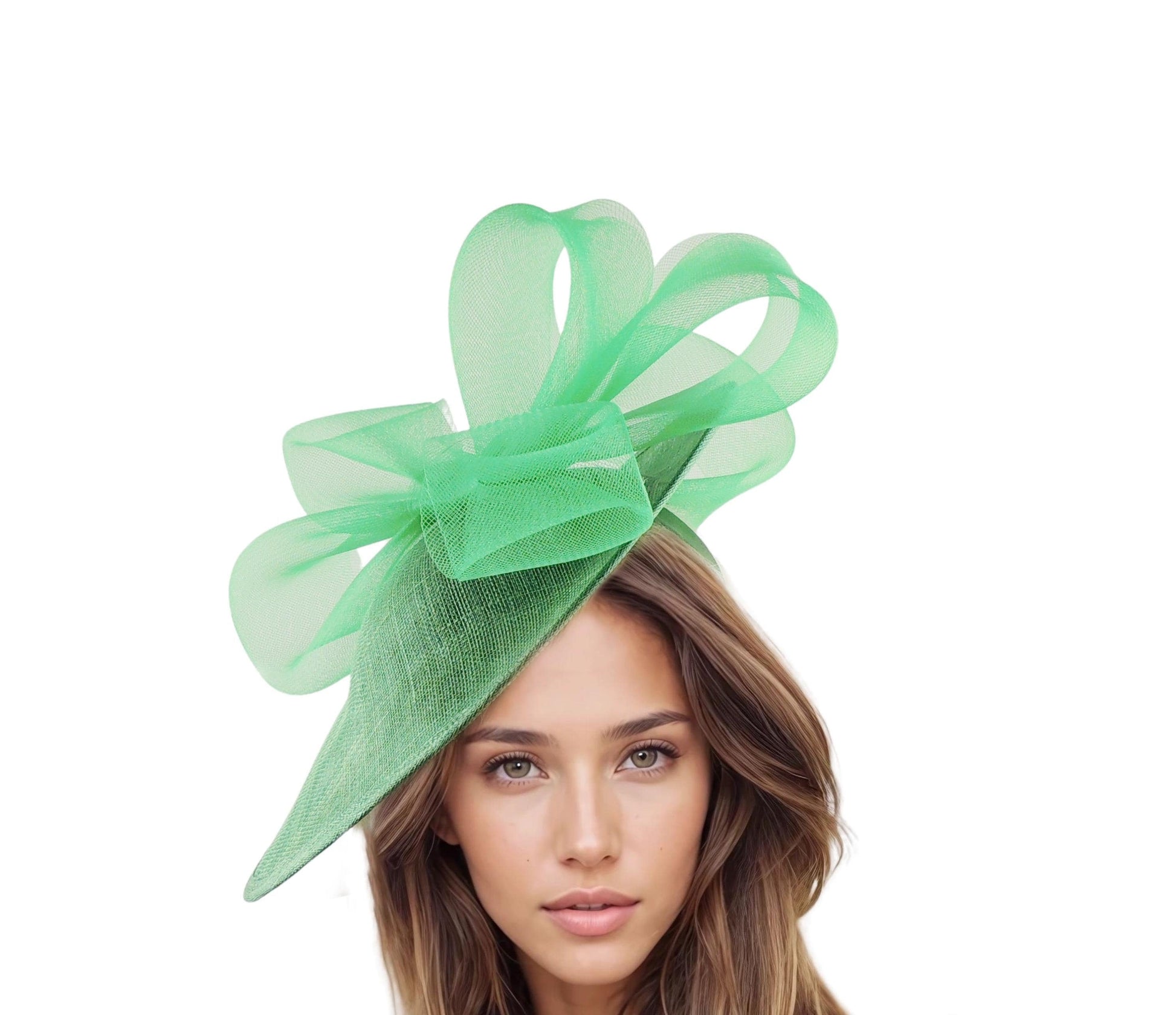 Beautiful kelly green crin loops and bow on a emerald sinamay base