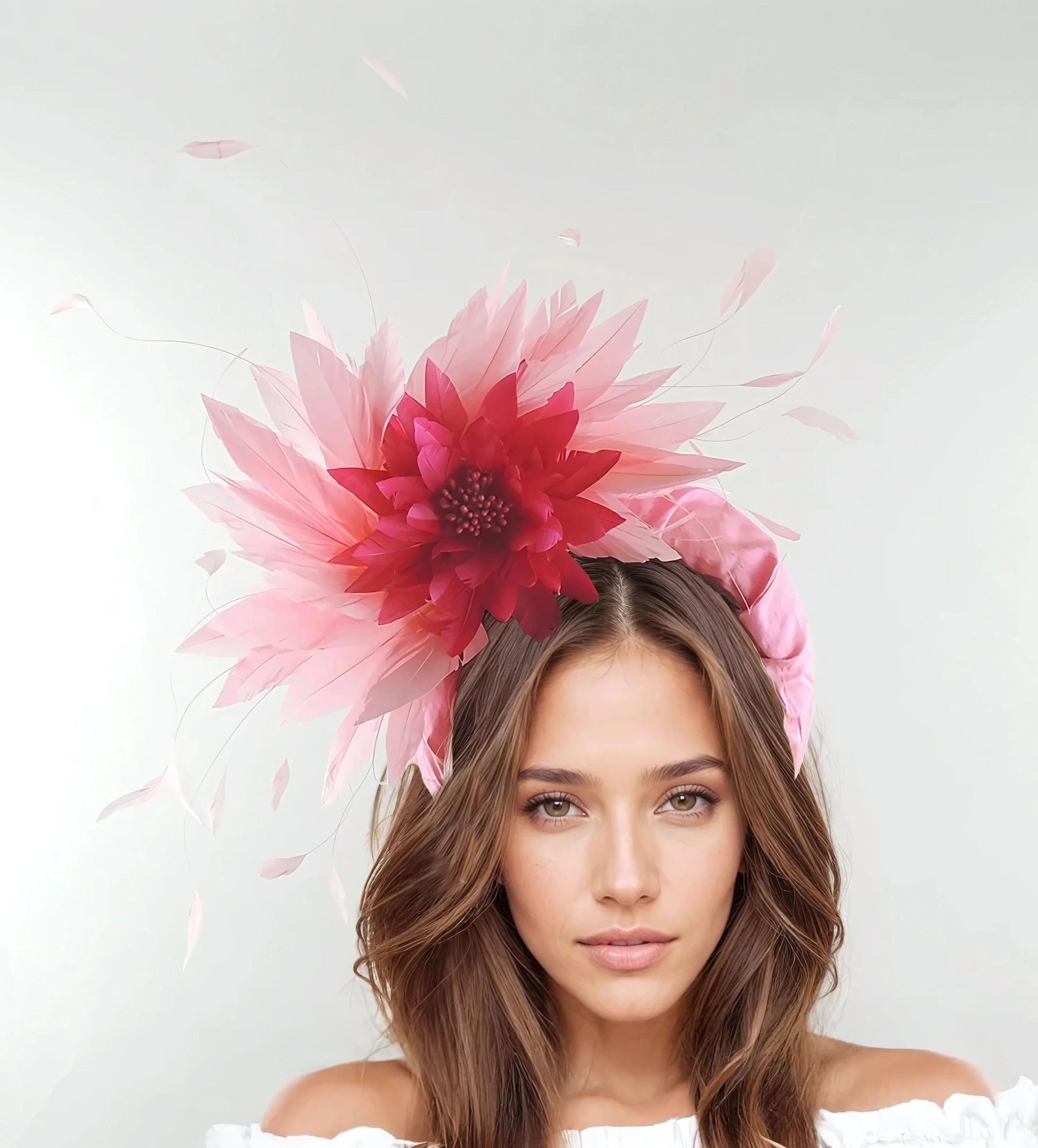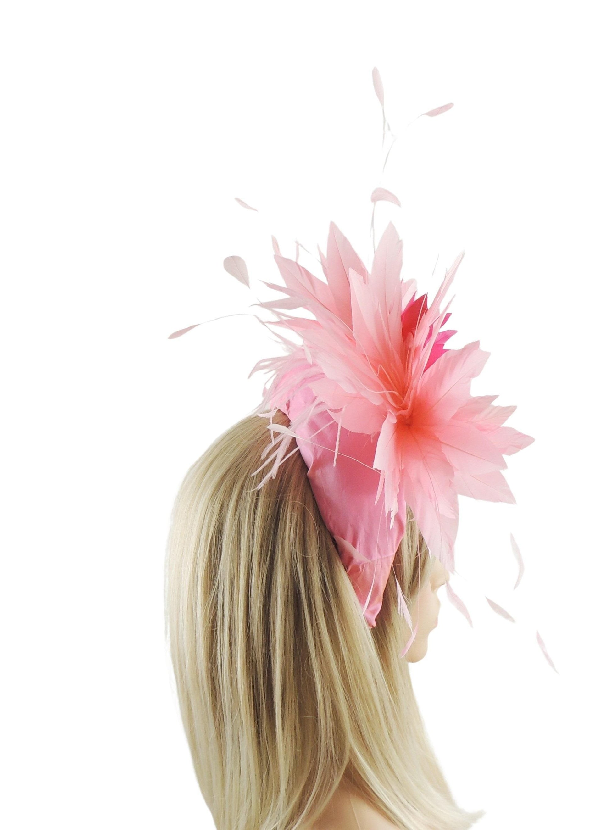 Featuring an extra-wide 8cm padded headband wrapped in luxurious shot dupion silk, this fascinator is adorned with a delicate fuchsia feather flower surrounded by a spray of candy pink feathers for a vibrant and sophisticated look.