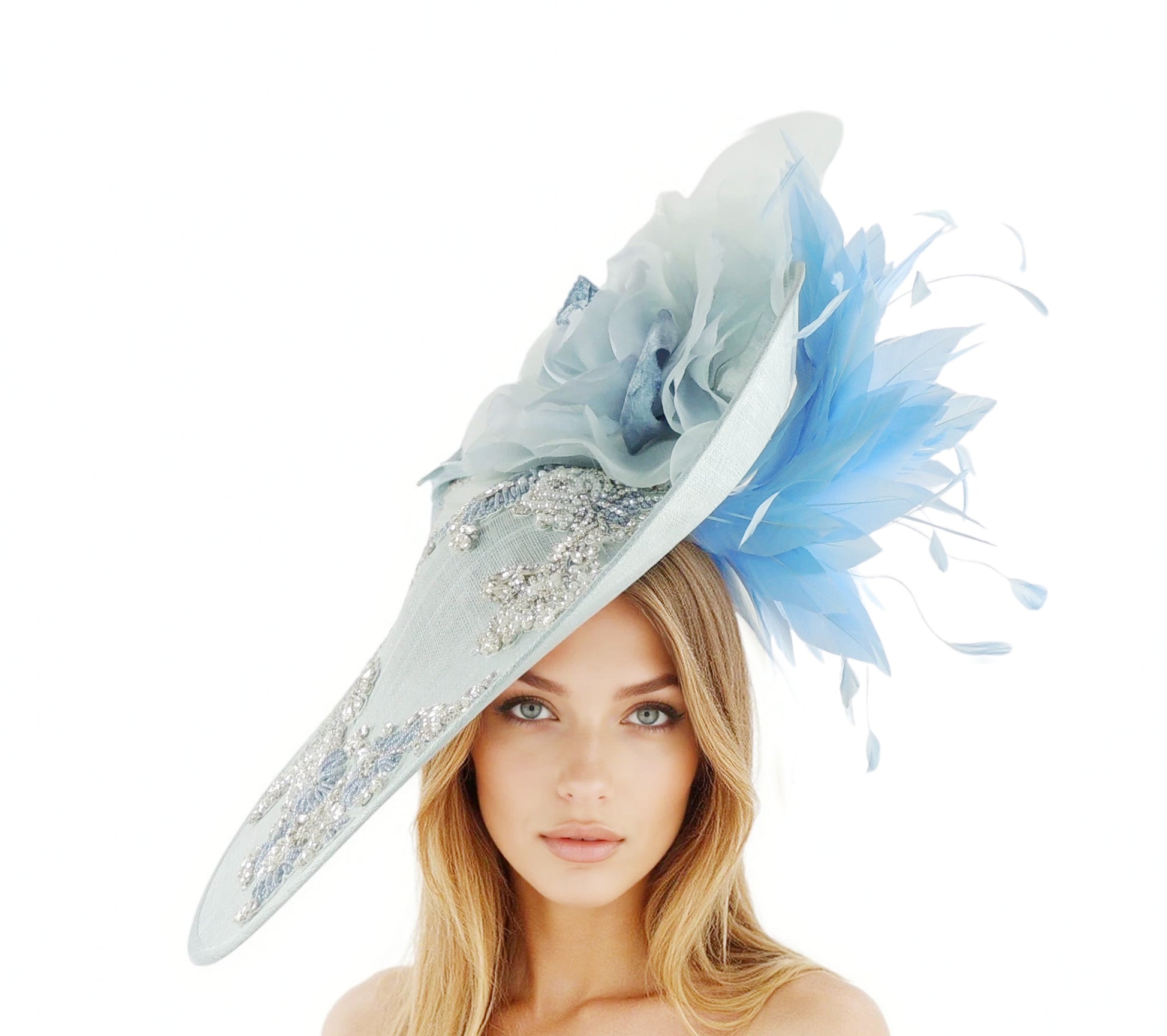 Beautiful mass of sage moss green and grey spiky feathers surround a sinamay base encrusted with hand sewn jewels, embroidery and crystals. We can make in any colour lilac, black, emerald, pink etc.