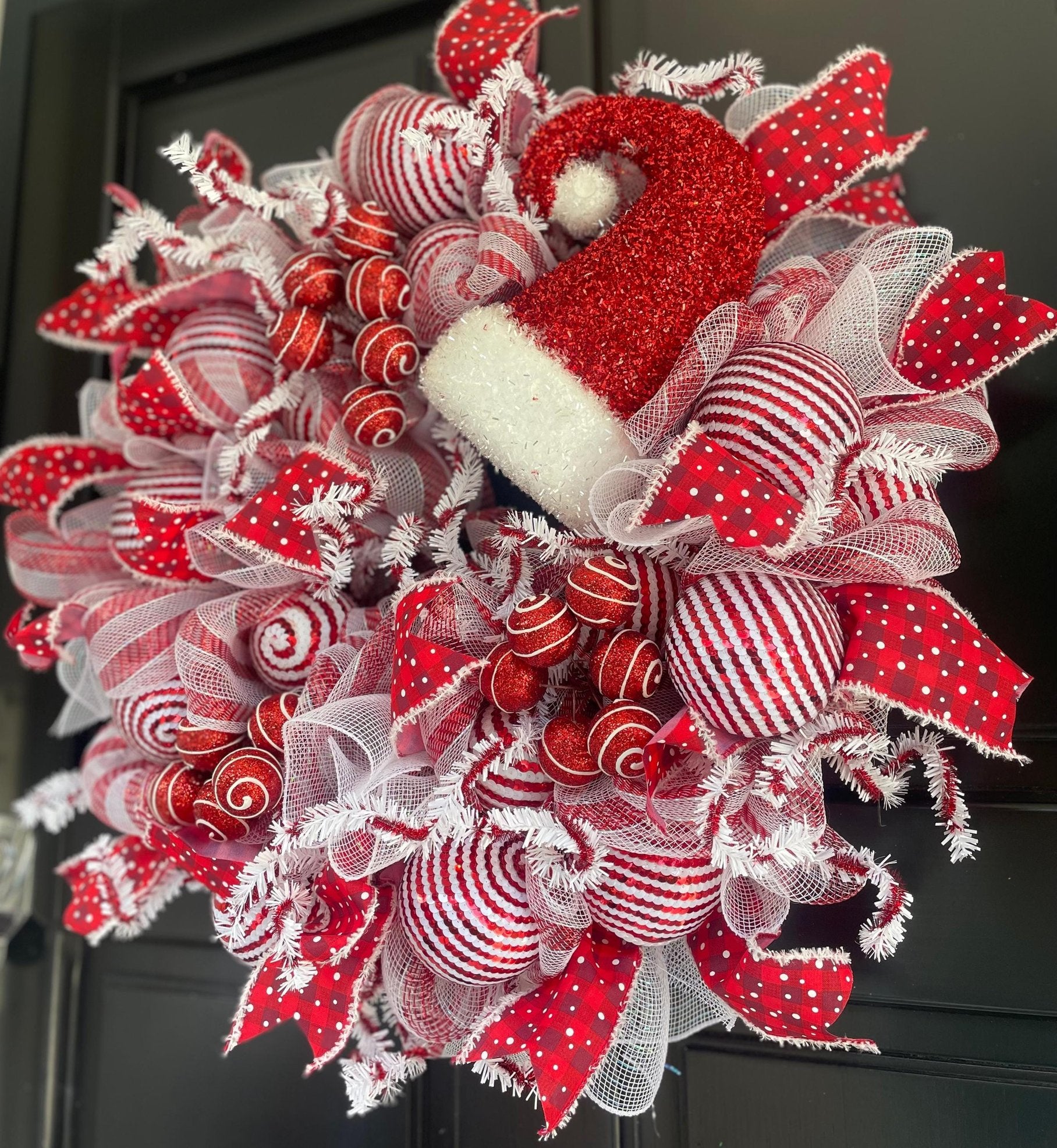 ✨ Handmade Festive Elegance – 50cm Statement Piece Welcome the holiday season in style with this 50cm luxury Christmas wreath, bursting with vibrant red and white mesh, ribbons, and sequin festive baubles. Topped with a sparkling Santa hat accent, it’s the perfect blend of festive cheer and elegant design. K