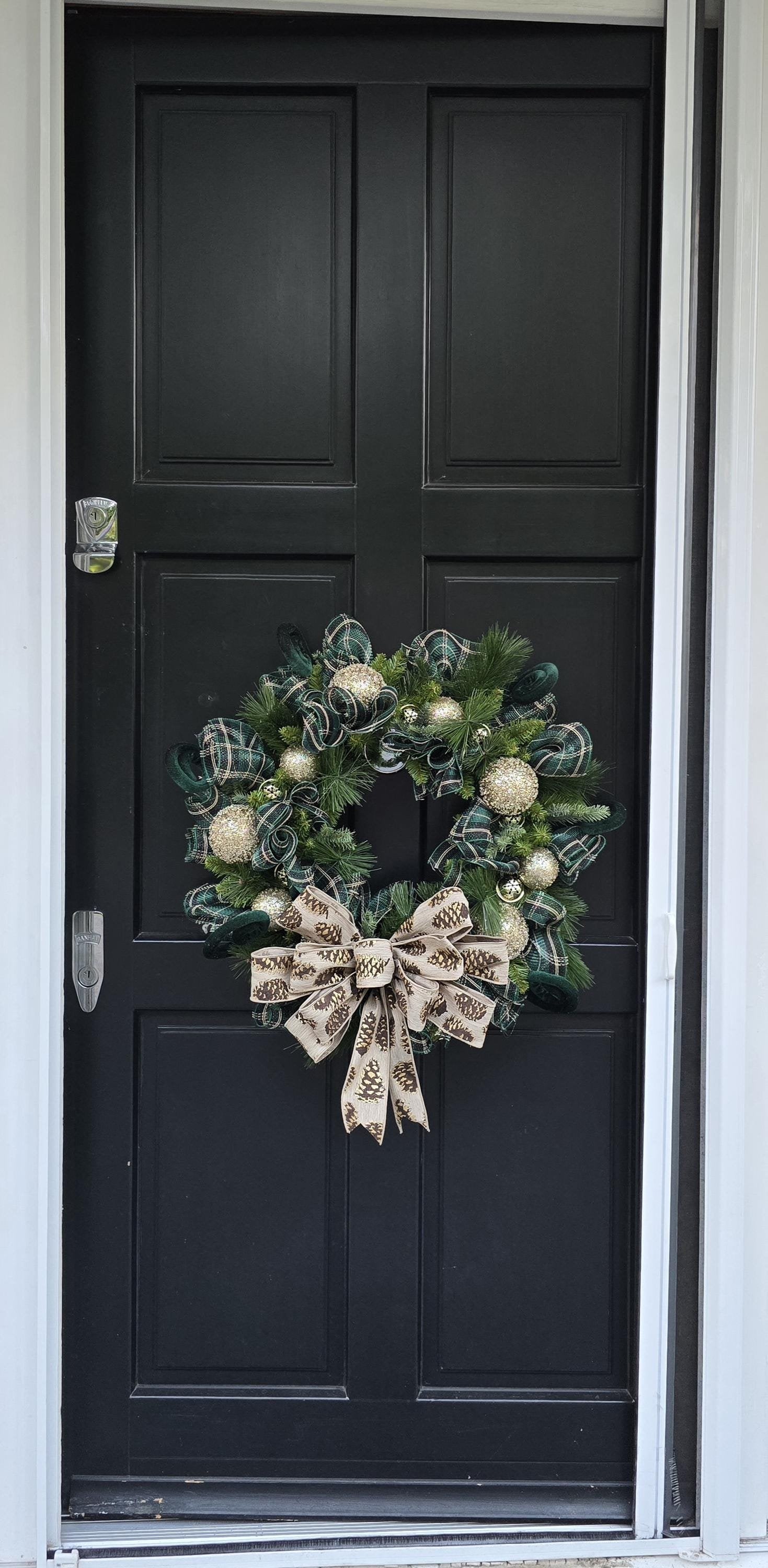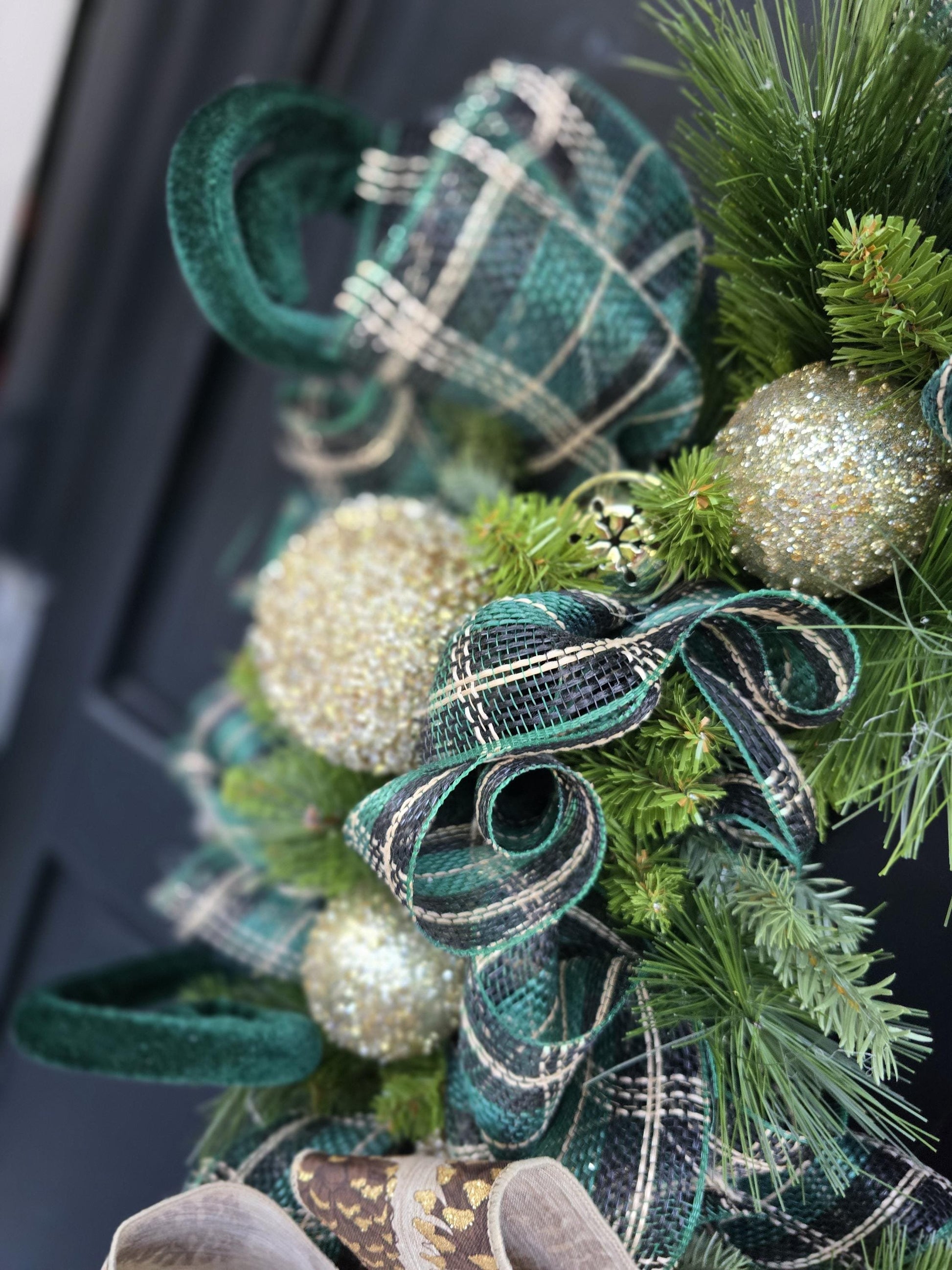 🎀 Materials: Long-needle pine, glitter gold baubles, gold bells, hunter green plaid mesh, designer pinecone glitter bow