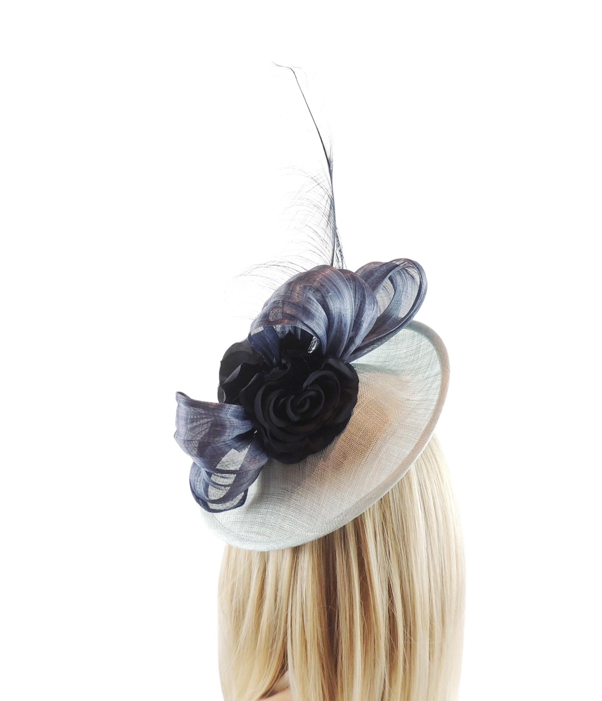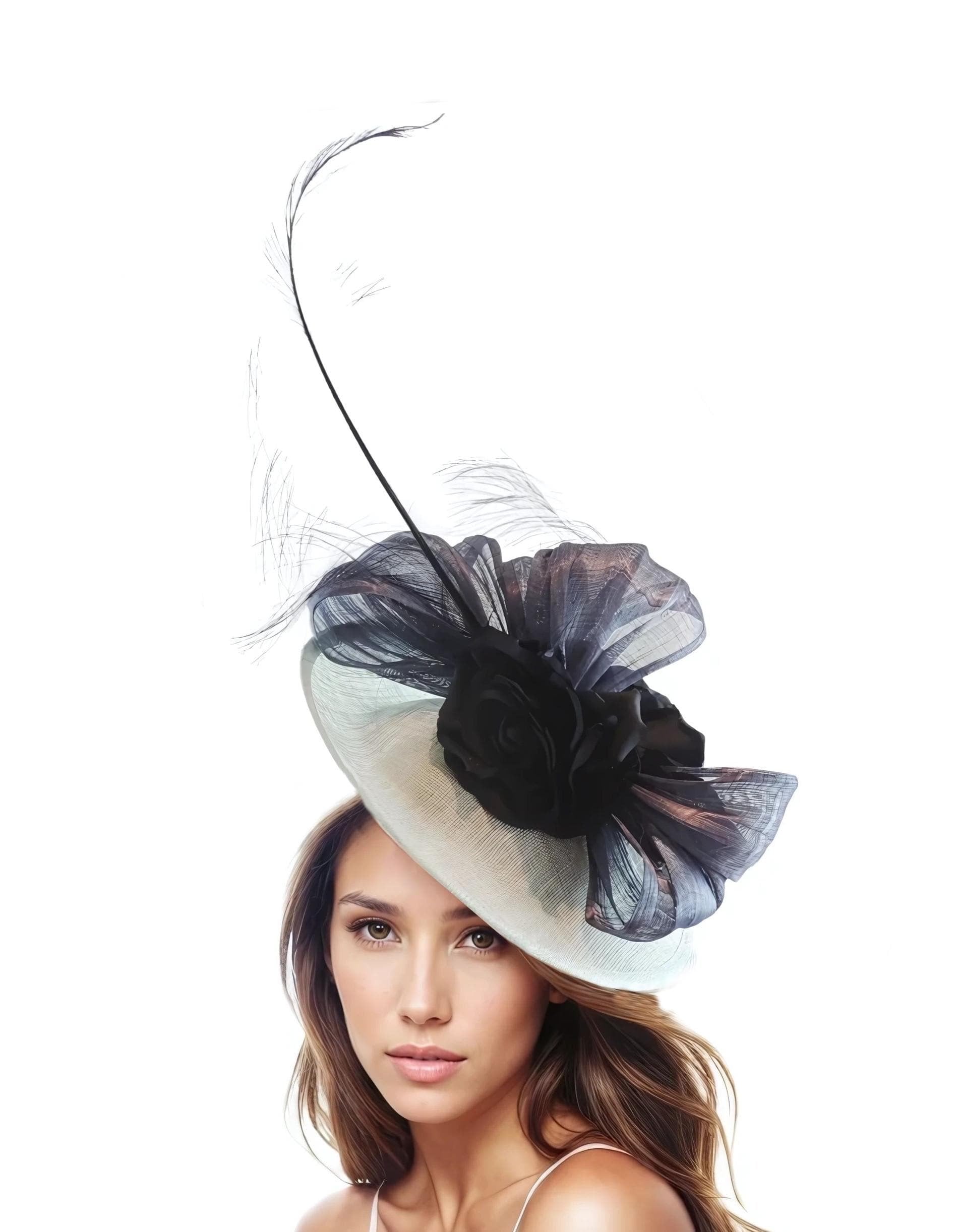 💖 This stunning fascinator features sculpted abaca silk swirled bow loops, delicate silk roses, and a dramatic burnt ostrich feather, all set on a large sinamay base for an effortlessly chic look.