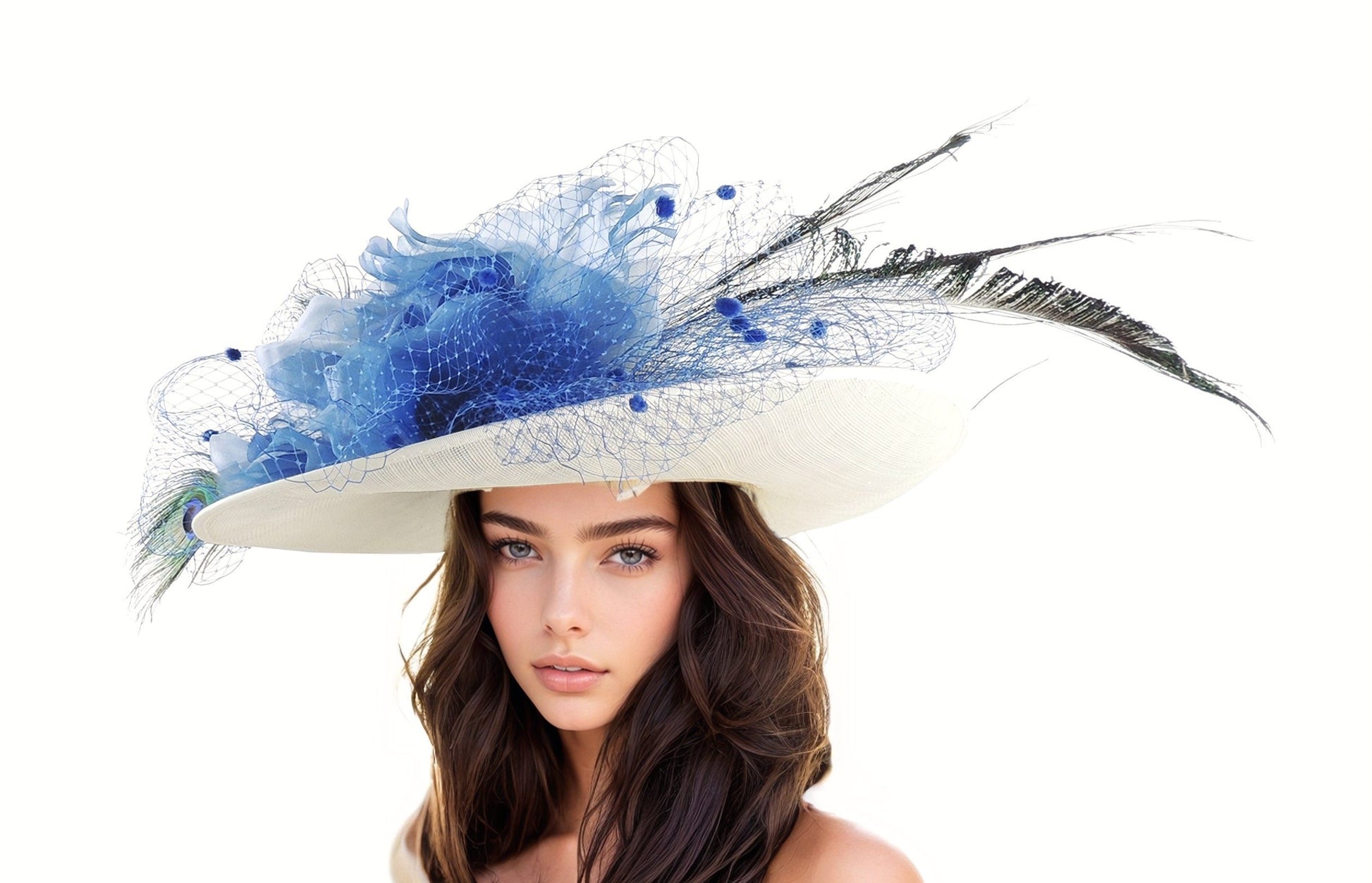 White Royal Blue Peacock Kentucky Derby Hat Ascot Church Ladies Race Day Tea Garden Party Wide Brim Wedding Formal Occasion Woman Statement