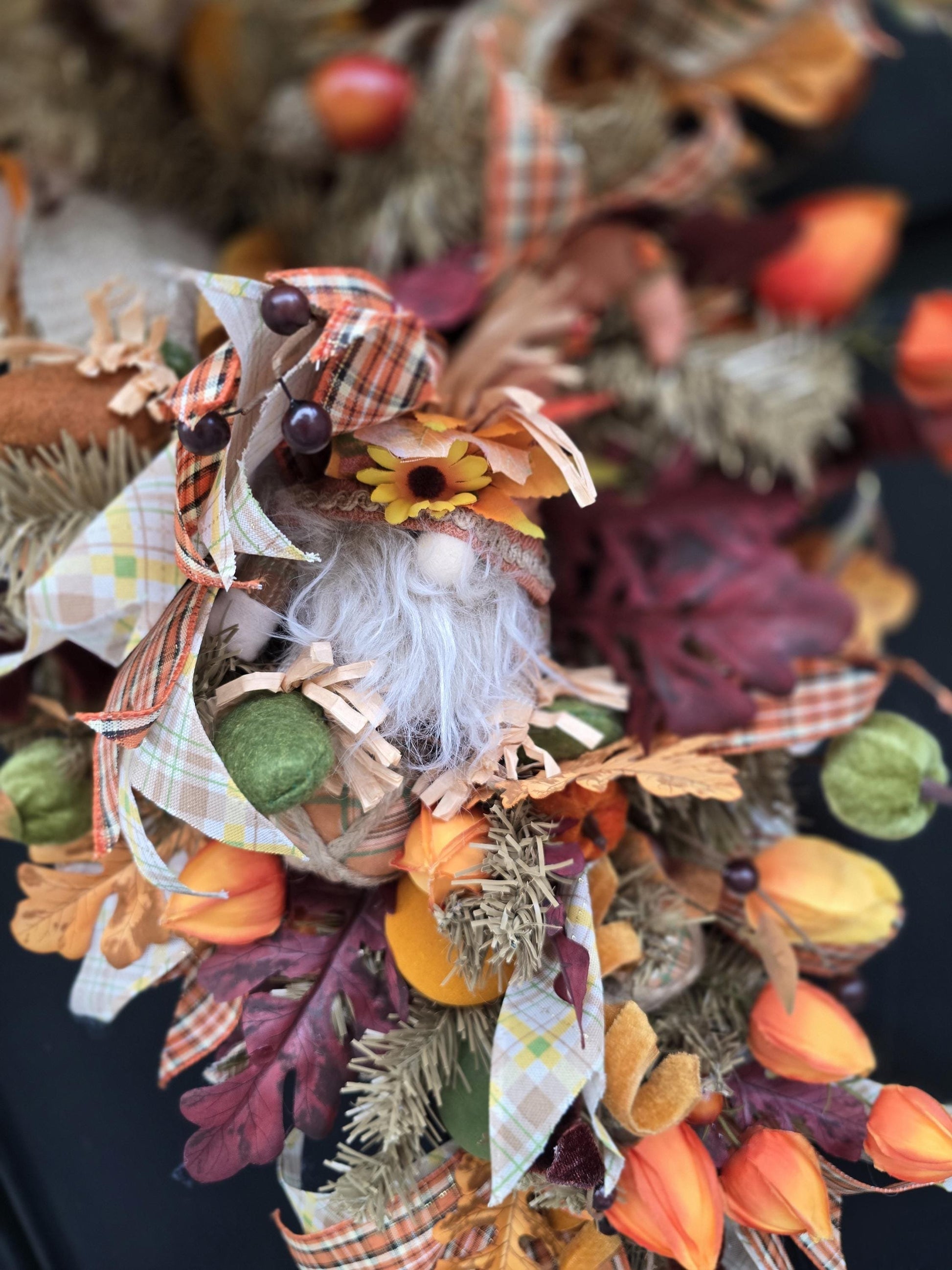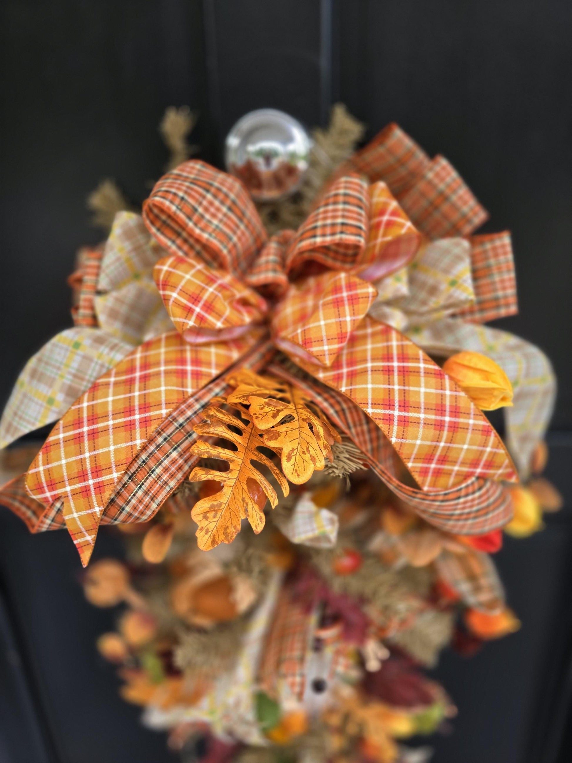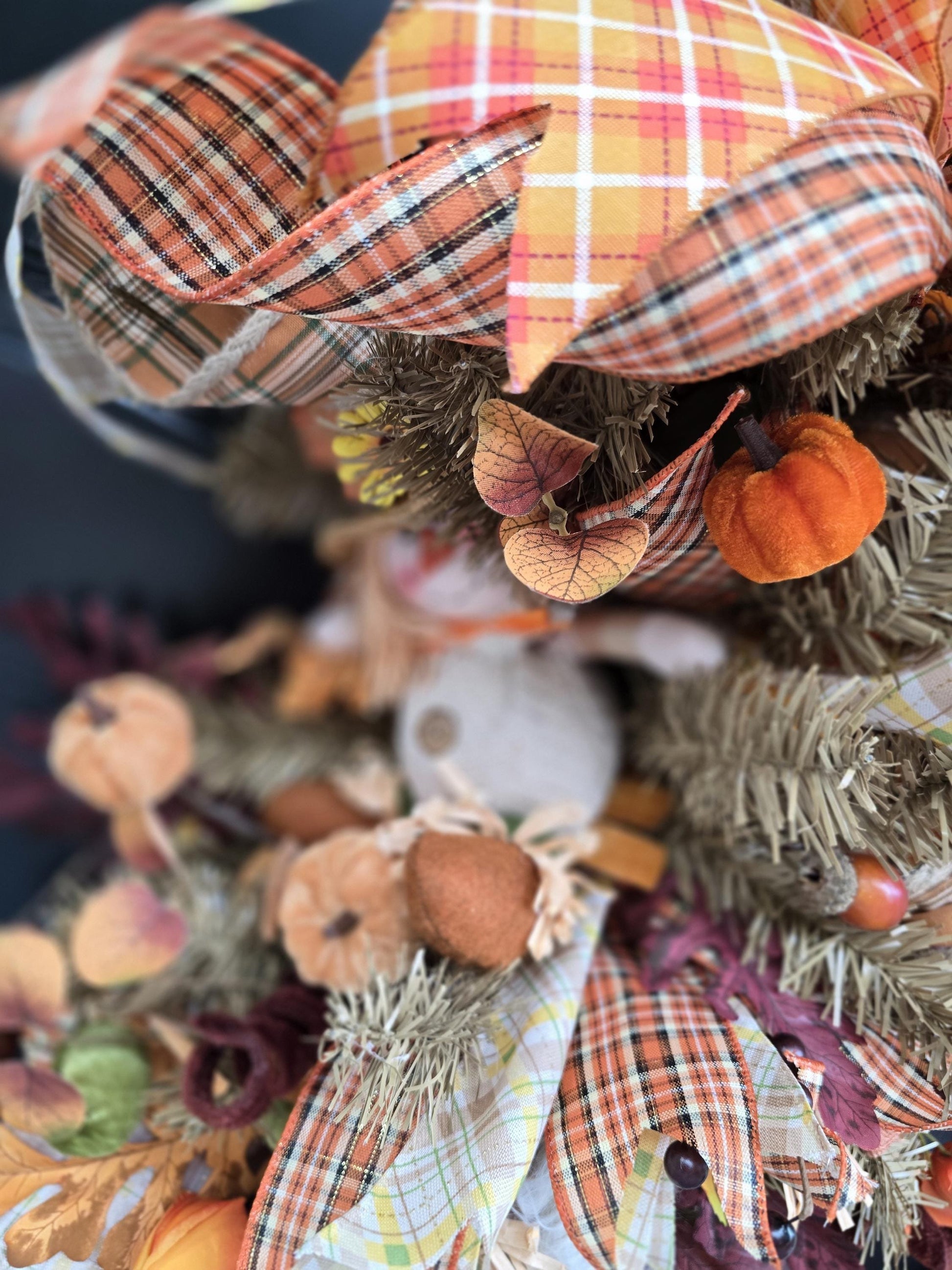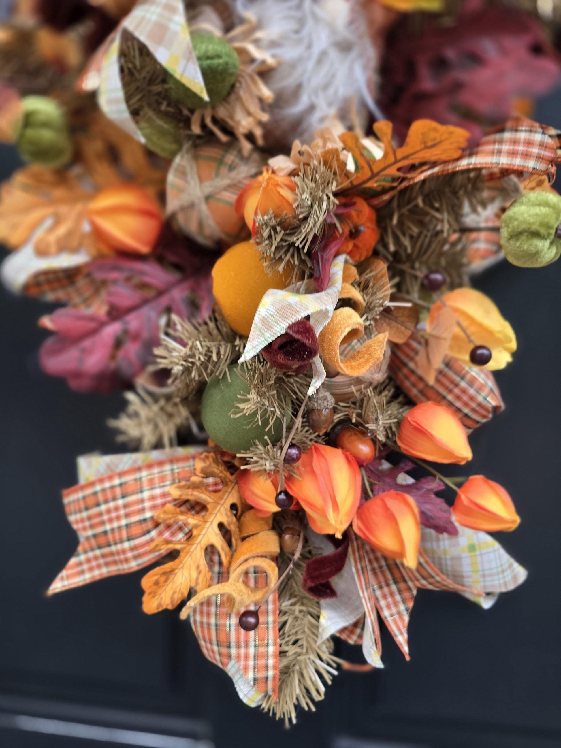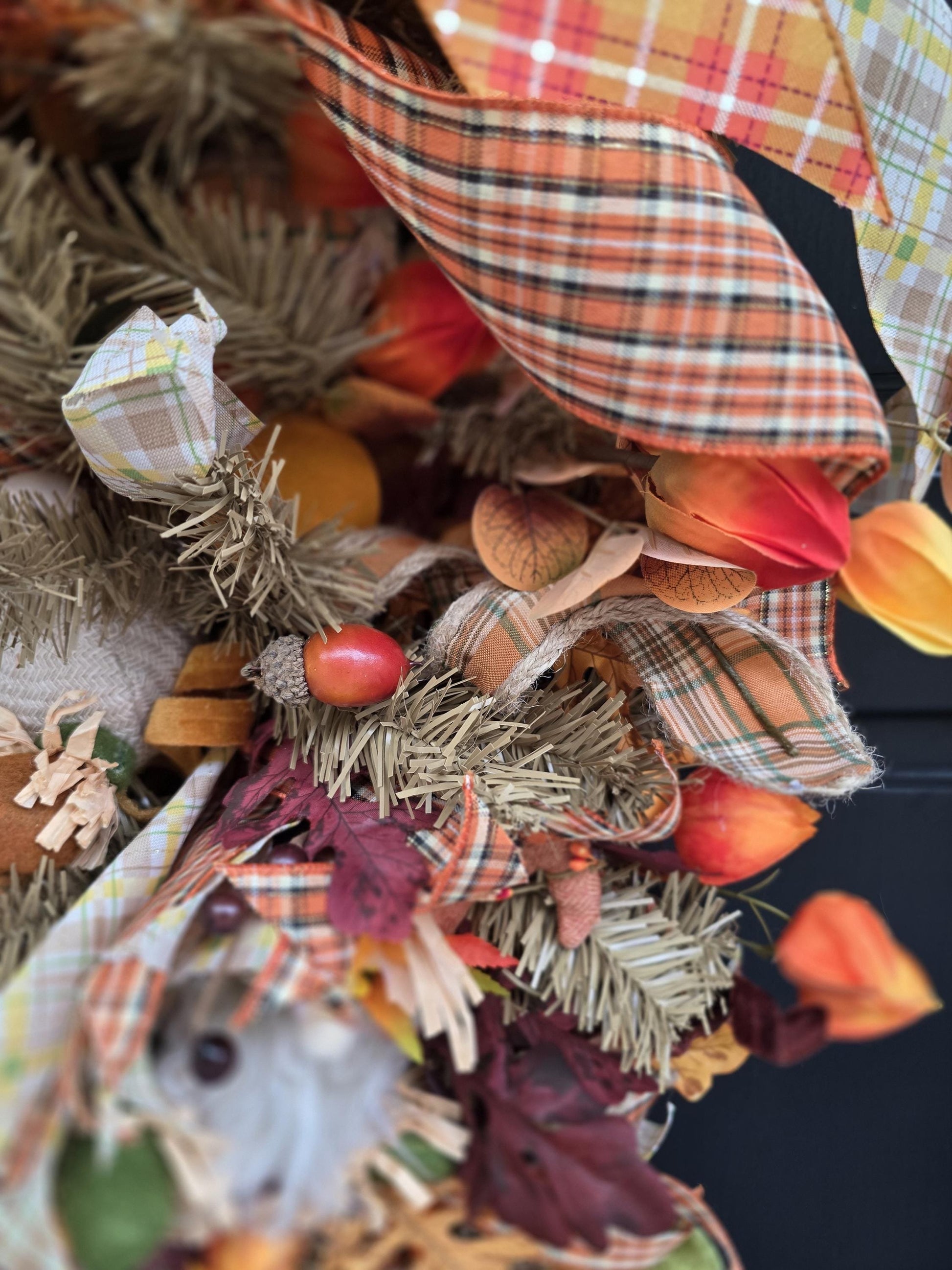 ✨ Features: Gorgeous autumn-colored ribbons Autumnal gonks and acorns for a rustic touch Fall leaves and lantern flowers for seasonal charm Velvet flocked balls and plaid curls for texture Velvet pumpkins and more for a festive finish Full, layered design with elegant depth