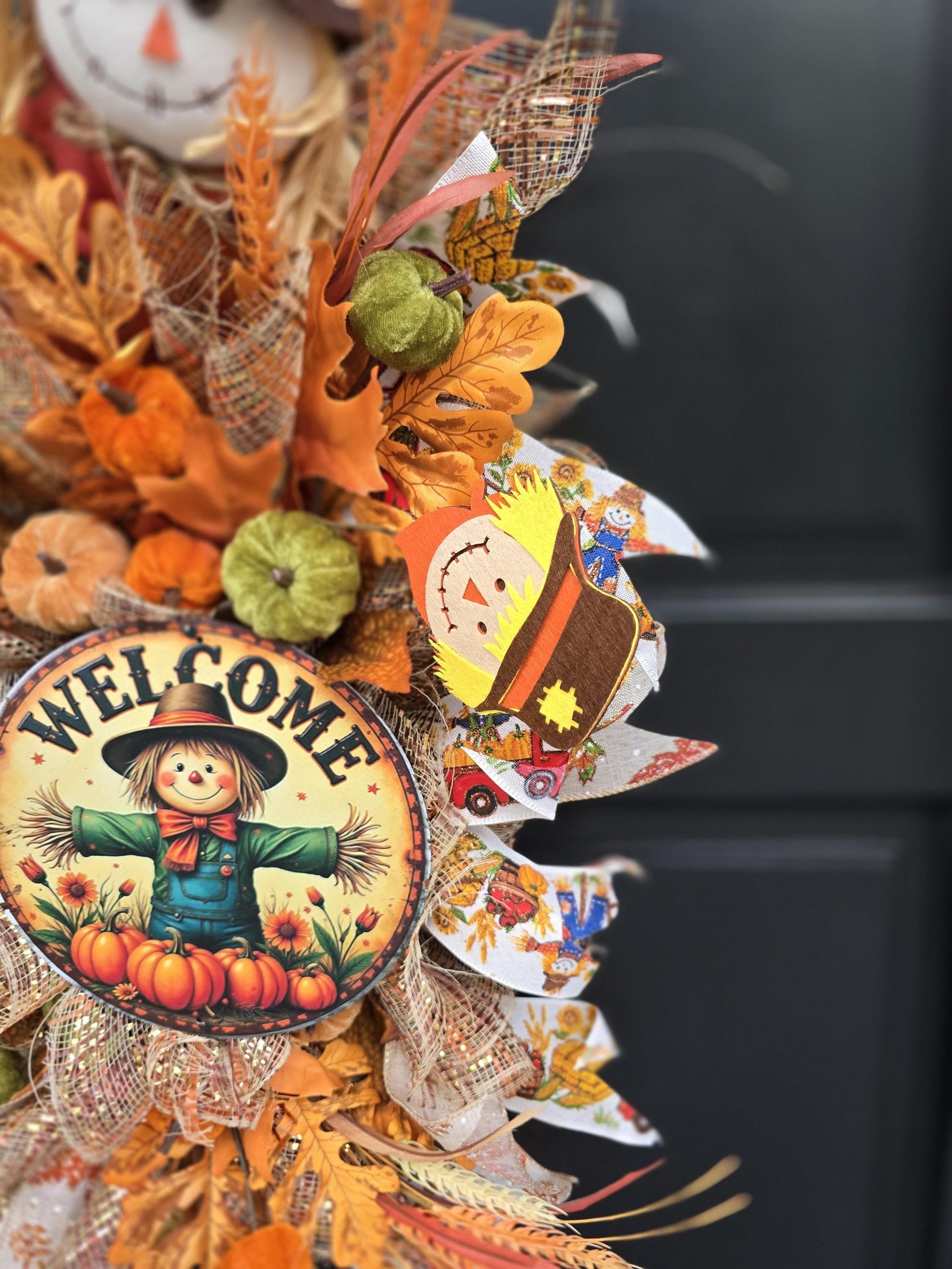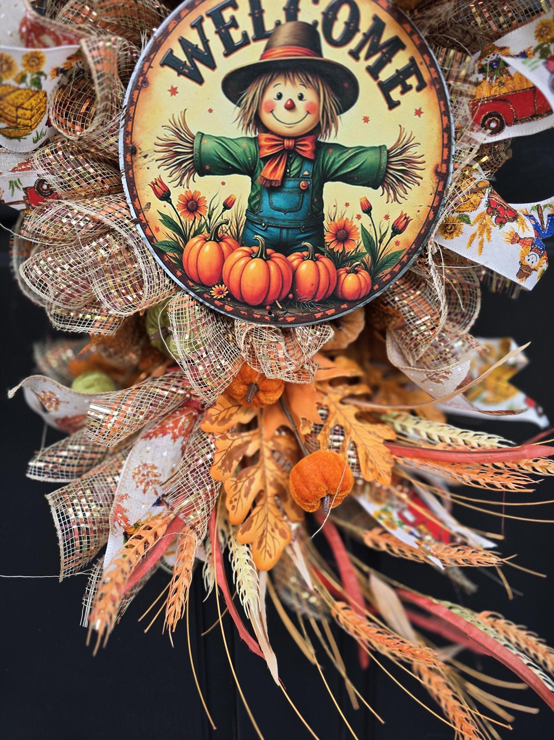 🎀 Materials: Deco mesh, designer ribbon, velvet pumpkins, artificial autumnal wheat, fall leaves, scarecrow sign