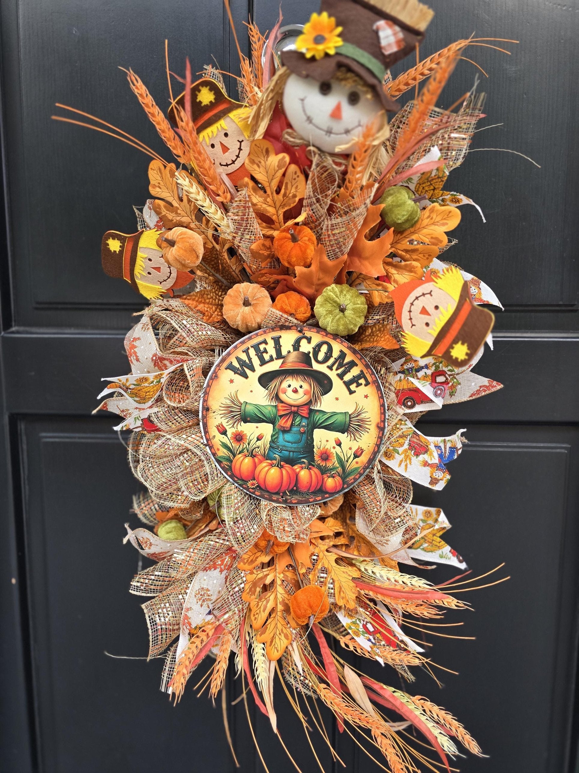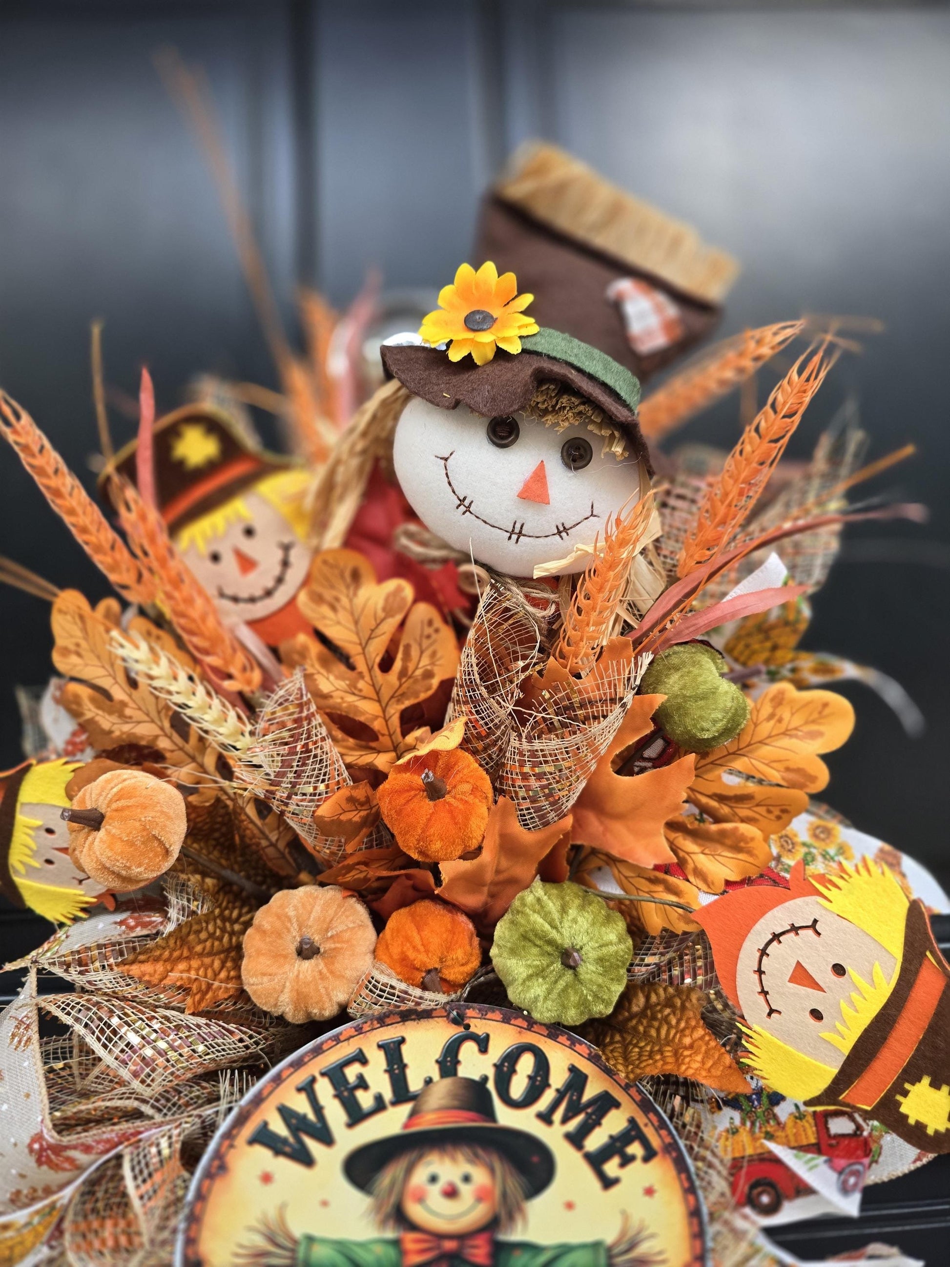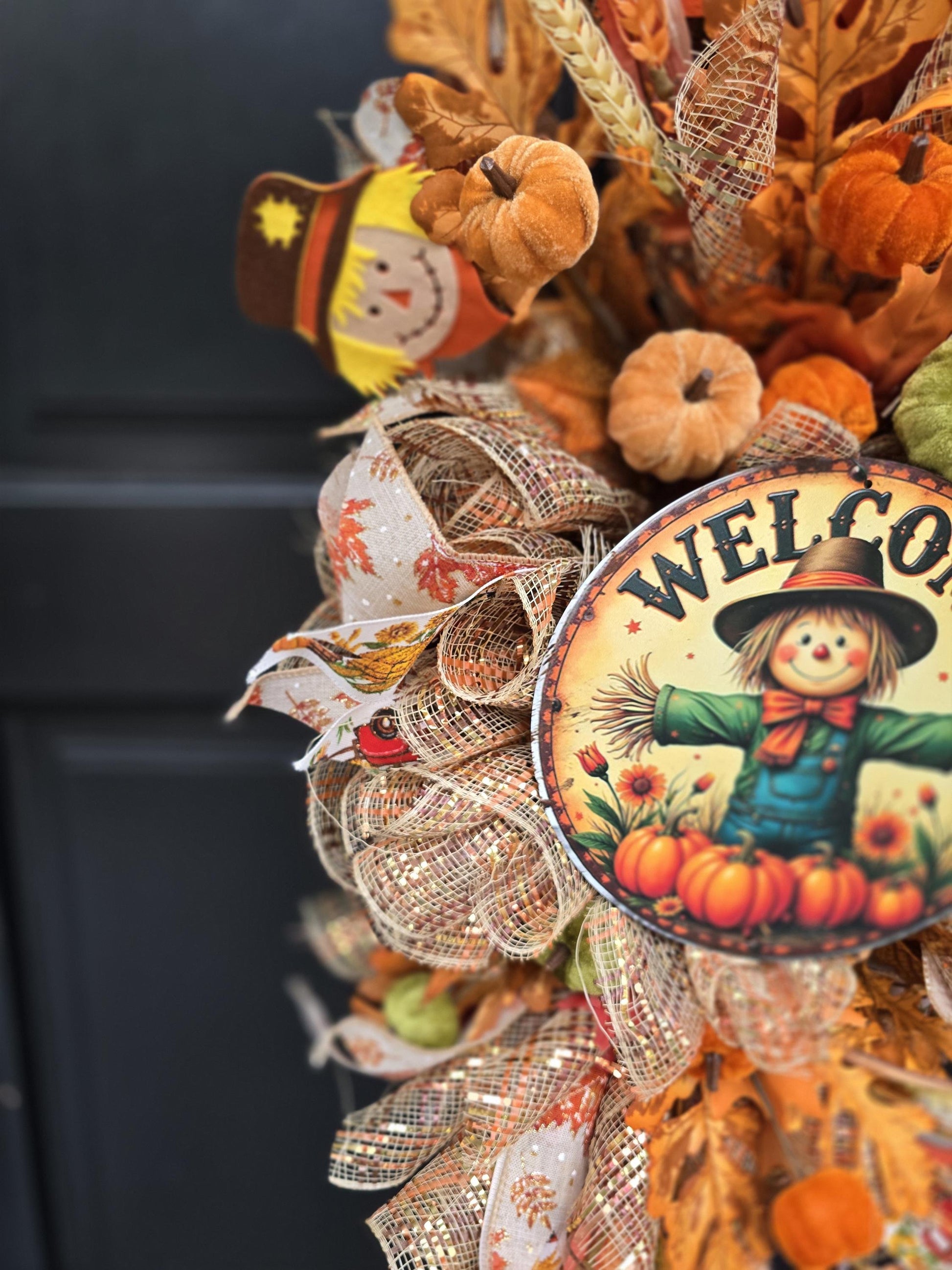 ✨ Features: "WELCOME" scarecrow sign as a charming focal point Designer ribbon throughout for elegant flair Velvet pumpkins for a plush autumn touch Artificial autumnal wheat for rustic texture Fall leaves for seasonal vibrancy Full, layered design with warm depth and flow